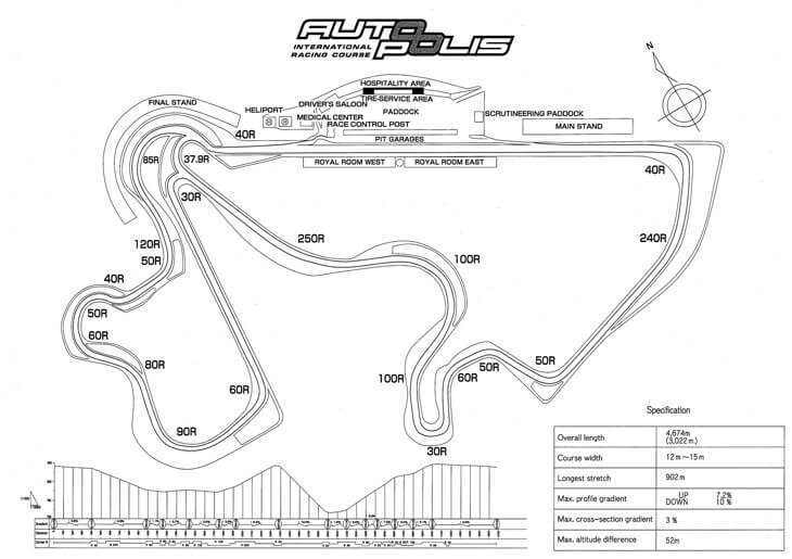 ホームストレートは902m、高低差は52m、最大上り勾配7.2%、下り勾配10%のアップダウンの激しいテクニカルコースと言えます。そのため、タイヤの摩耗度が激しく、一部レーサーからは「タイヤ泣かせのコース」と言われているそうです。日本では珍しく、ピットロードがコースの外側あり、ピットから見るとマシンの走行方向が他のサーキットと逆になります。