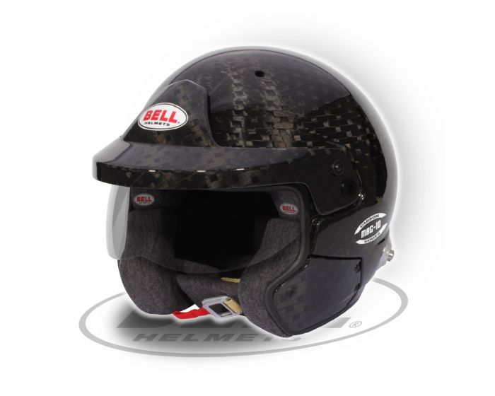 The BELL MAG-10 Carbon helmet features an ultra-lightweight carbon composite shell, an adjustable carbon fiber peak, and an adjustable integrated sunscreen. It is certified to meet the FIA 8859-2024 and SNELL SA2020 standards.